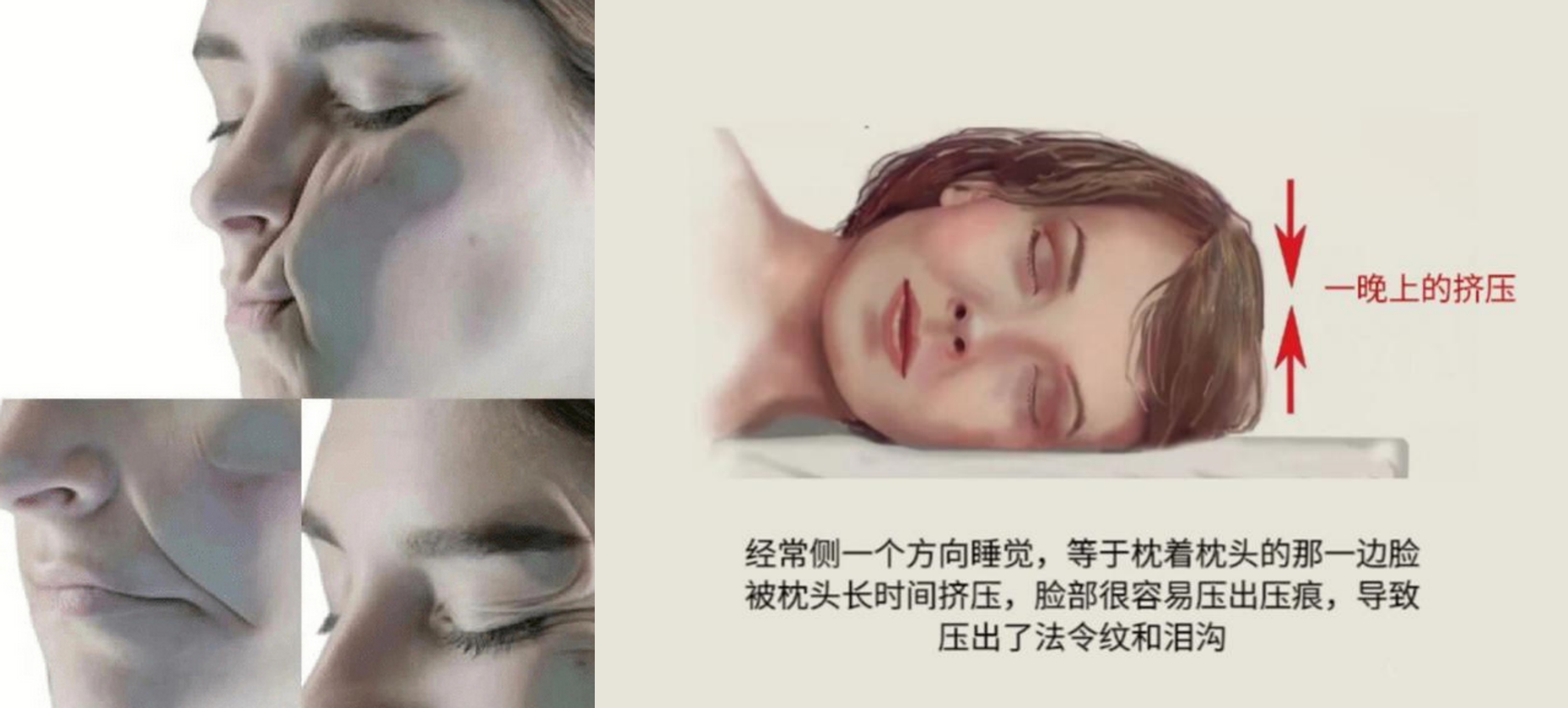 另外一大原因也往往最容易被忽视,就是睡眠压迫损伤,也叫压迫性衰老,属于外在加速。国际皮肤抗衰研究会在2023年的一项研究报告中就有指出压迫性衰老,当侧睡时脸部承受的压力约等于一瓶1.5升矿泉水的重量,从而导致胶原纤维呈45°的断裂,另外脸接触枕头会产生摩擦损耗,从而使角质层产生0.1mm级裂纹,日积月累就会导致皮肤老化状态显露。